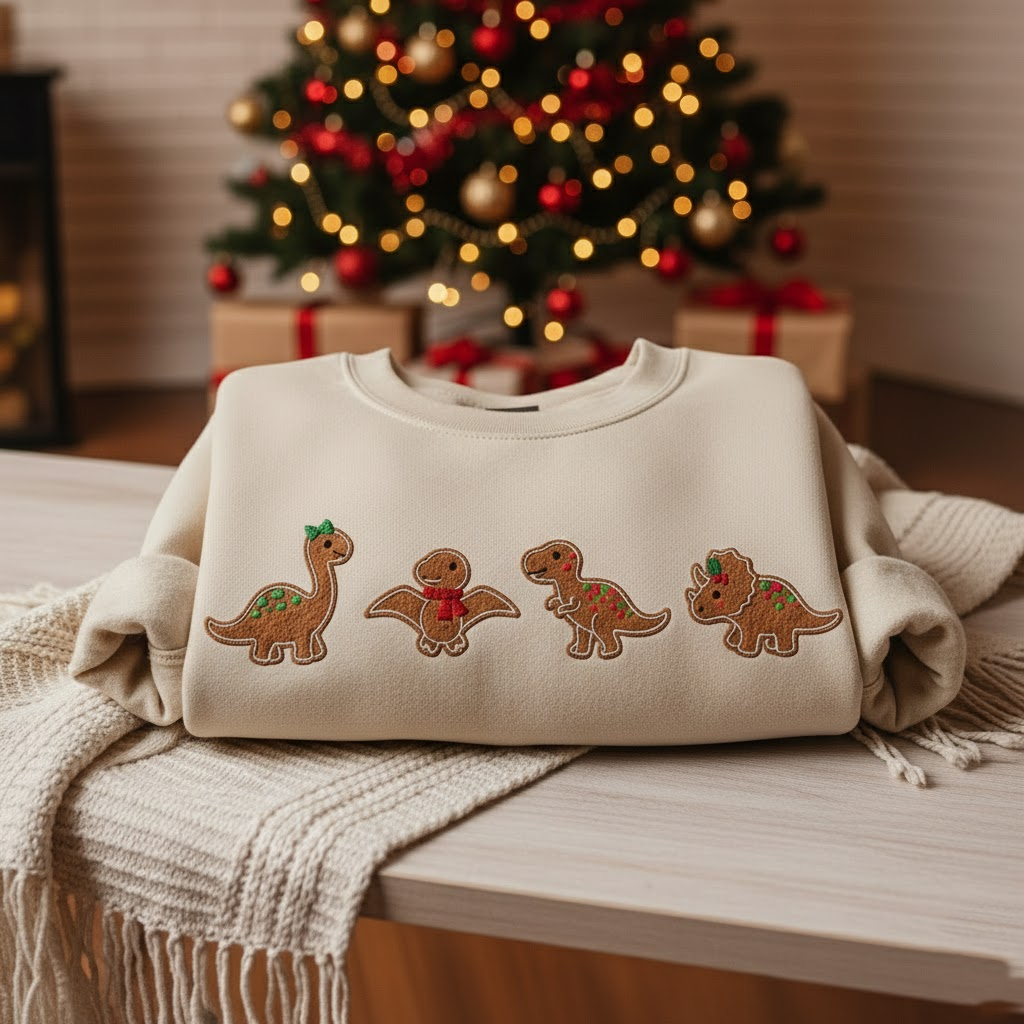 Christmas Dinosaur Embroidered Sweatshirt, Cute Gingerbread Dino Crewneck, Gingerbread Cute Dino Embroidered Hoodie, Holiday Embroidery Gift for Kids & Adults