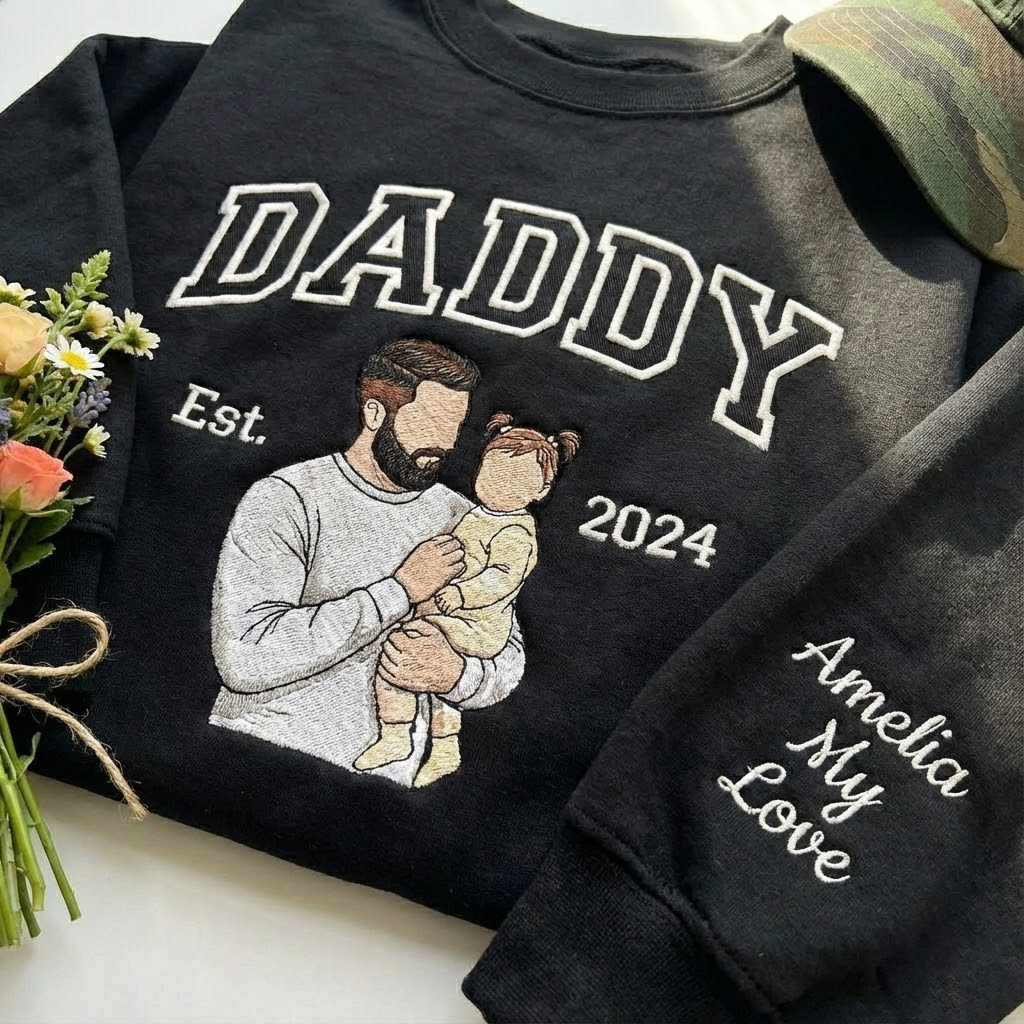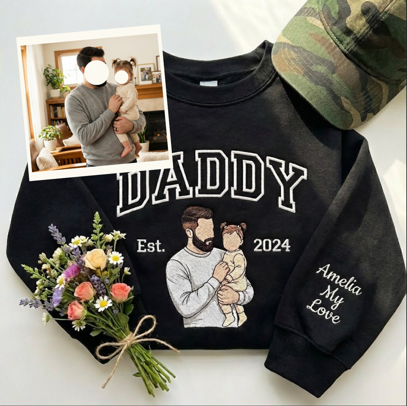 Custom Embroidered Dad Sweatshirt with Photo, Fathers Day or Birthday Gift for Dad, Personalized Dad and Daughter Hoodie, Embroidered Portrait Shirt
