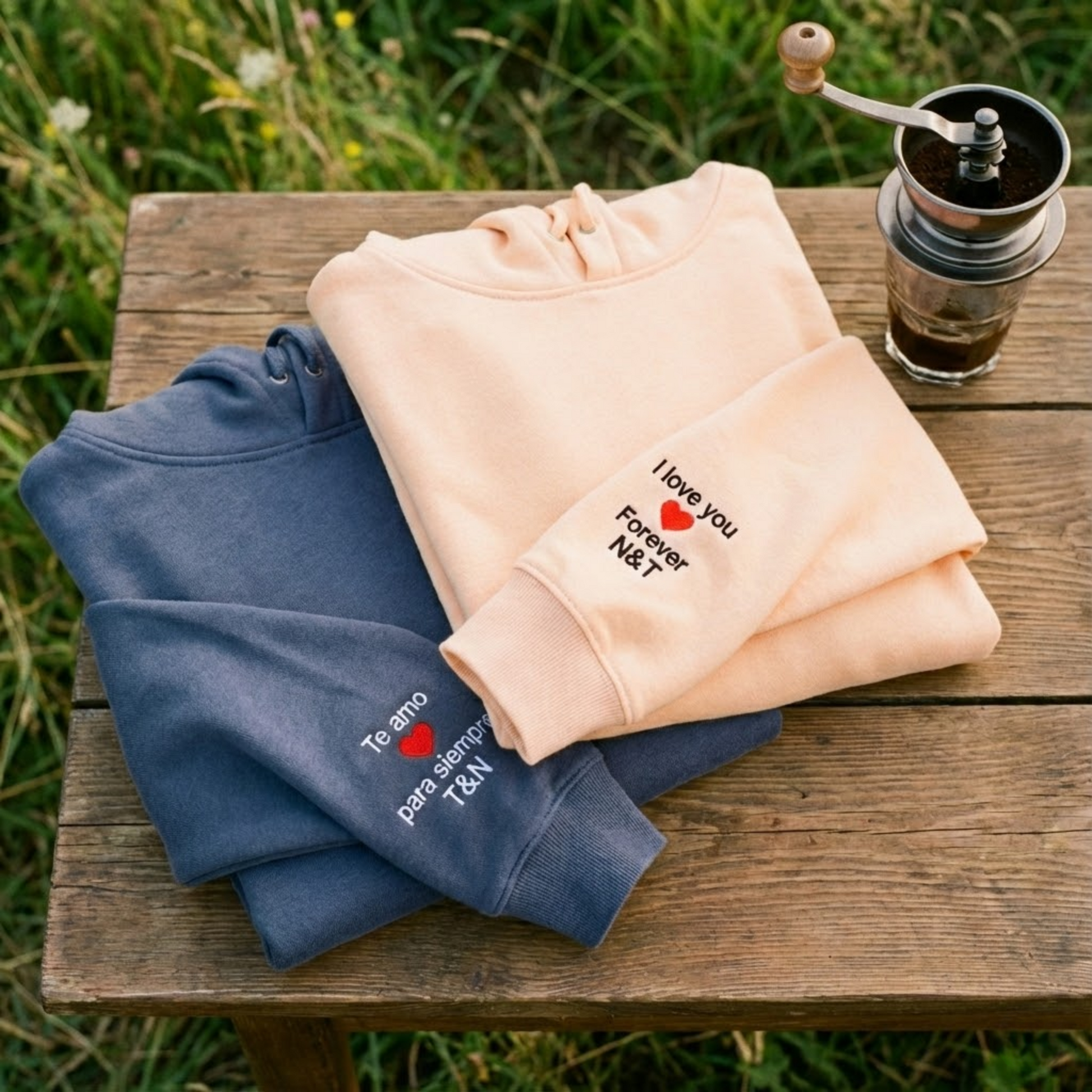 Custom Embroidered I Love You Forever Couple Couples Hoodie, Initial With Heart On Sleeve, Anniversary Gift, Valentines Day Gift