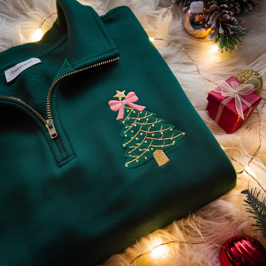 Embroidered Christmas Tree Quarter Zip Sweatshirt: Chrismas Coquette Shirt, Christmas Gift for family, Coquette Holiday Style